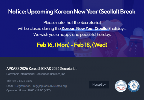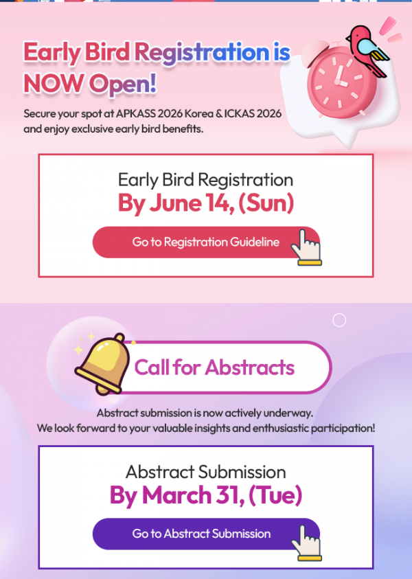 서브 컨텐츠 내용 You can check the title, registrant, registration date, inquiry and details..APKASS 2026 Korea & ICKAS 2026 안내 작성자 : admins 작성일 : 2026-02-25 00:21:35 조회수 : 7리스트 Information about previous, next posts이전글이전글이 없습니다.다음글[대한골대사학회] 대한골대사학회 SSBH 2026 & 제38차 춘계학술대회